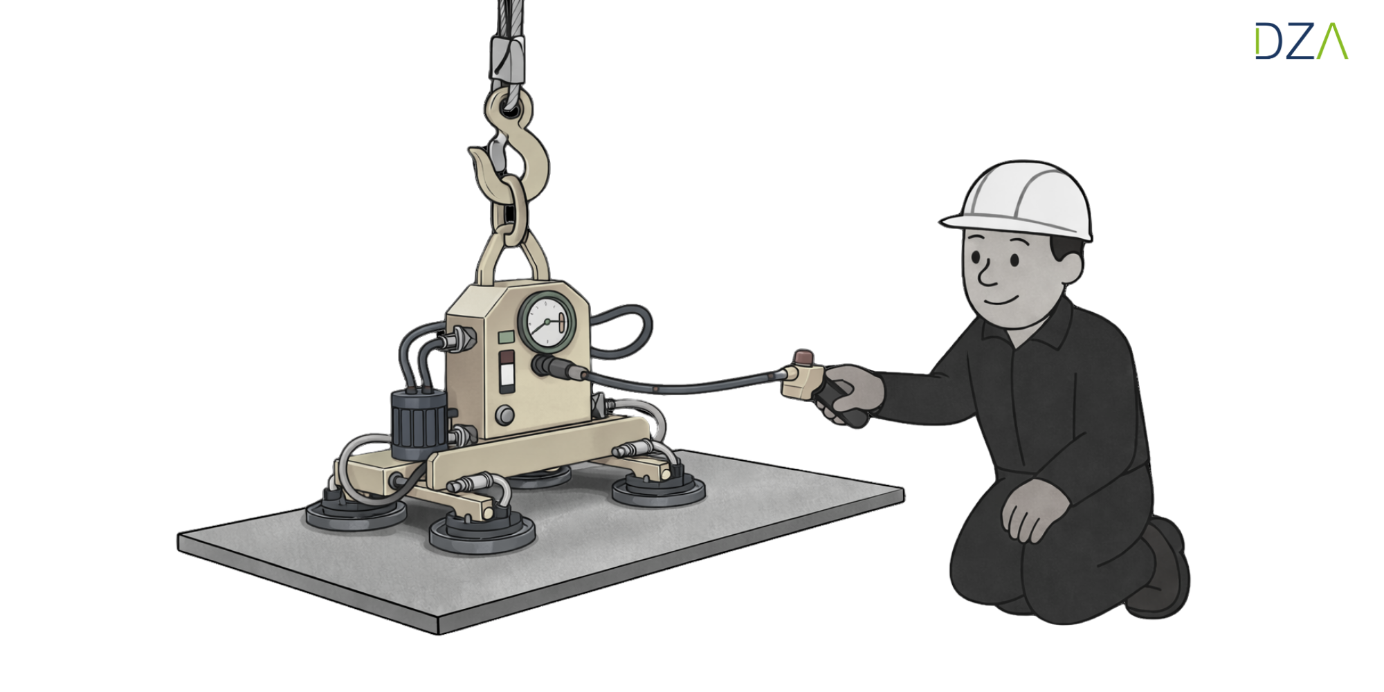 Vakuumheber nutzen Unterdruck, um Lasten wie Bleche, Glas oder glatte Oberflächen anzusaugen. Sie müssen die Abreißkraft (mindestens 1,5-fache Last) und die Abgleitkraft (mindestens 2-fache Last) einhalten. Als Bediener kontrollieren Sie stets die Druckanzeige und stellen sicher, dass der Arbeits- und Gefahrenbereich klar markiert sind.