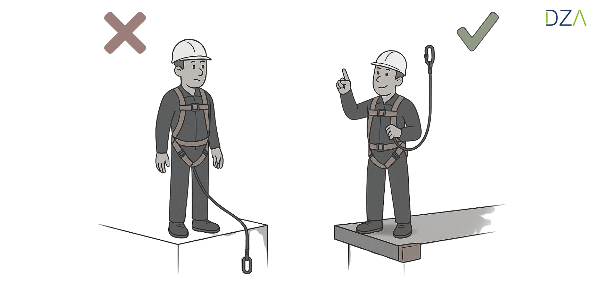 Halten Sie das Verbindungsmittel so kurz wie möglich und vermeiden Sie scharfe Kanten, indem Sie Kantenschutz verwenden. Nutzen Sie nur Anschlagpunkte, die dafür vorgesehen und stabil genug sind, die beim Sturz entstehenden Kräfte aufzunehmen.
