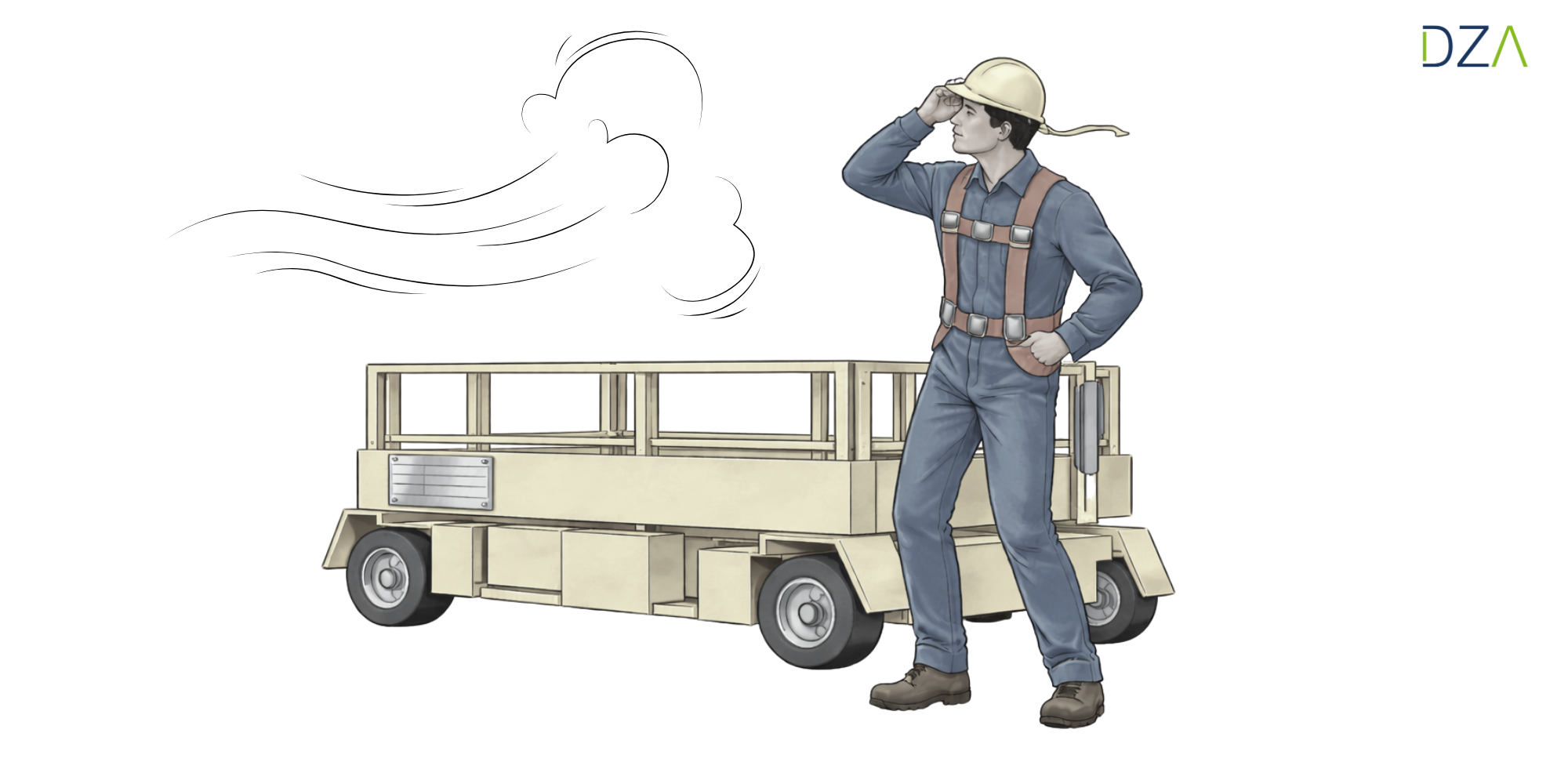 Windstärke 0 bedeutet praktisch Windstille, der Rauch steigt senkrecht nach oben. Bei Windstärke 1 bis 3 erkennen Sie die Windrichtung am Rauch, spüren leichte Luftbewegungen im Gesicht und sehen erste kleine Zweige wackeln. Bewegen sich bereits dünne Äste, spricht man von Windstärke 4. Ab Windstärke 5 beginnen kleine Bäume zu schwanken. Kritisch wird es bei Windstärke 6 (etwa 10,8–13,8 m/s): Das ist die Grenze, ab der Hubarbeitsbühnen nicht mehr betrieben werden dürfen. Ein guter Vergleich ist ein Regenschirm, der sich sofort nach hinten umklappt – dann müssen Sie die Arbeit sofort einstellen. Alles darüber hinaus ist absolut tabu.