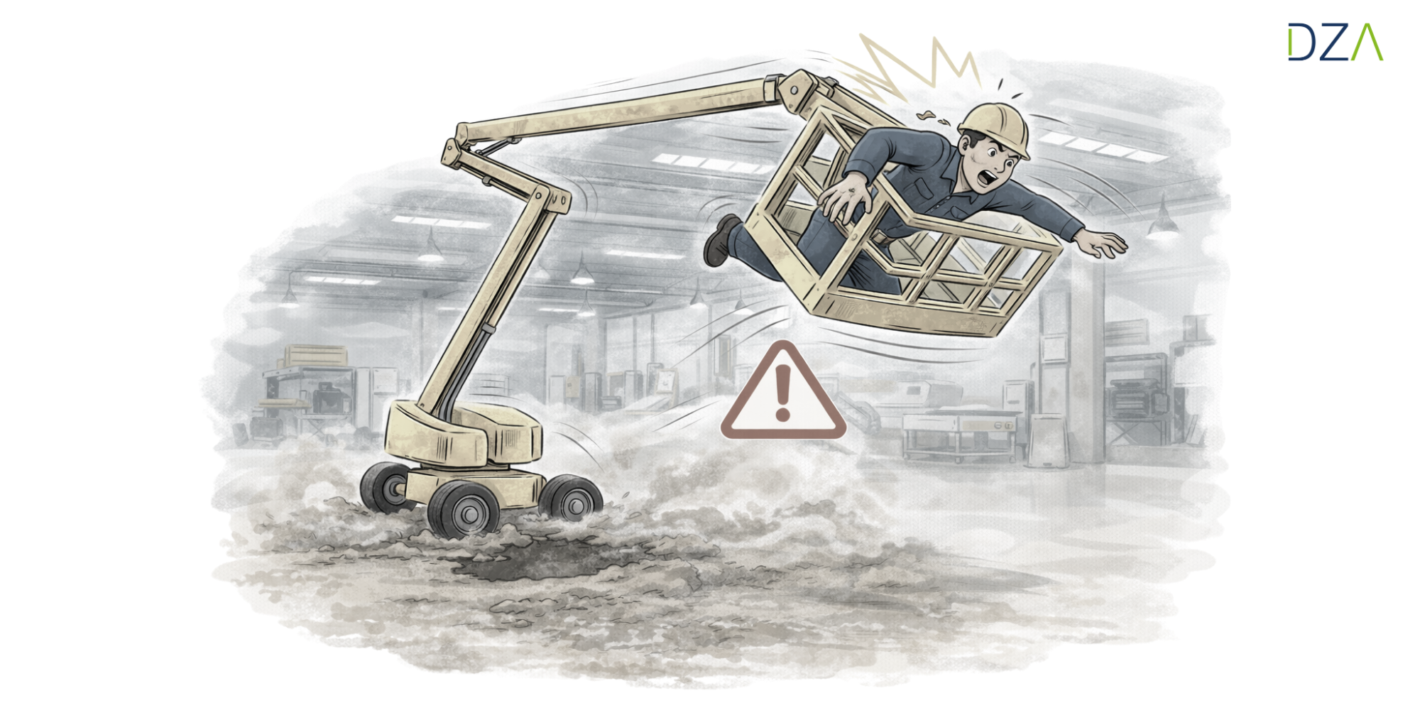 Ein Mitarbeiter sollte in einer Produktionshalle eine defekte Hallenlampe austauschen. Dafür nutzte er eine Gelenkteleskopbühne, die bereits von seinem Kollegen im Vorfeld bereitgestellt worden war. Der Bediener führte jedoch keine Funktions- und Sichtprüfung durch und verließ sich darauf, dass alles in Ordnung sei. Beim Verfahren der Bühne in vollständig ausgefahrener Höhe übersah er eine kleine Bodenabsenkung – eine kaum sichtbare Vertiefung im Hallenboden.