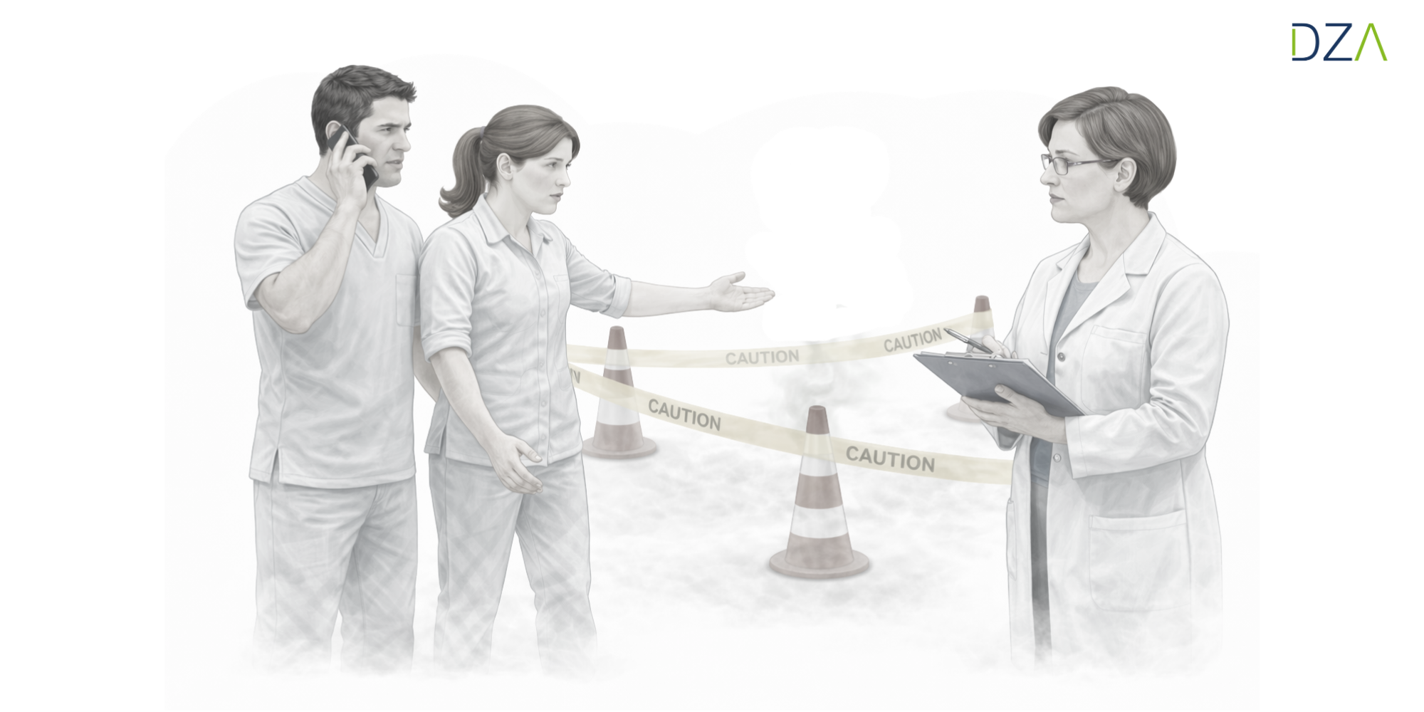 Sollte eine Gefahrensituation entstehen, handeln Sie besonnen und stoppen Ihre Tätigkeit sofort. Sichern Sie den betroffenen Bereich ab, warnen Sie andere Mitarbeitende und informieren Sie die zuständige Führungskraft.