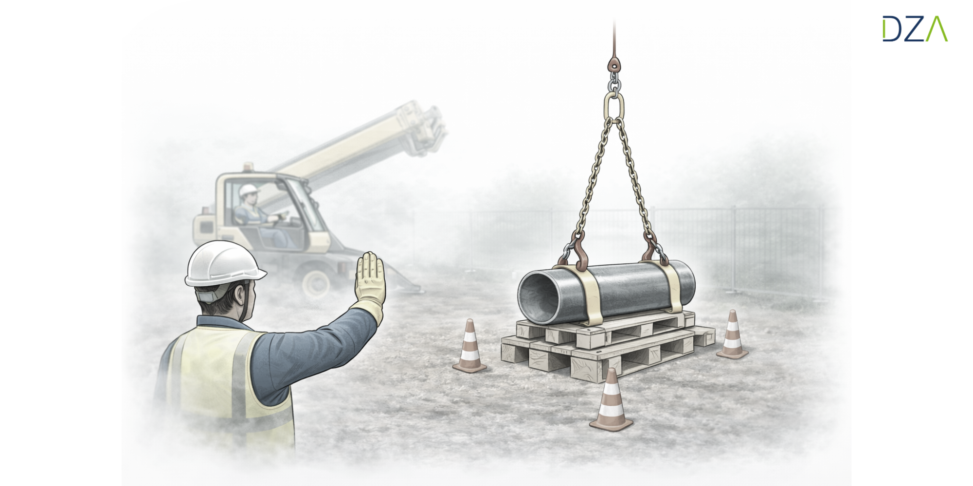 Der Einweiser muss sich an einem sicheren und gut einsehbaren Standort aufhalten, von dem aus er sowohl den Bediener als auch die Last jederzeit klar im Blick hat. Dieser Standort muss ausreichend Abstand zur Last bieten, eine schnelle Ausweichmöglichkeit ermöglichen und frei von Absturz- oder Einklemmgefahren sein.