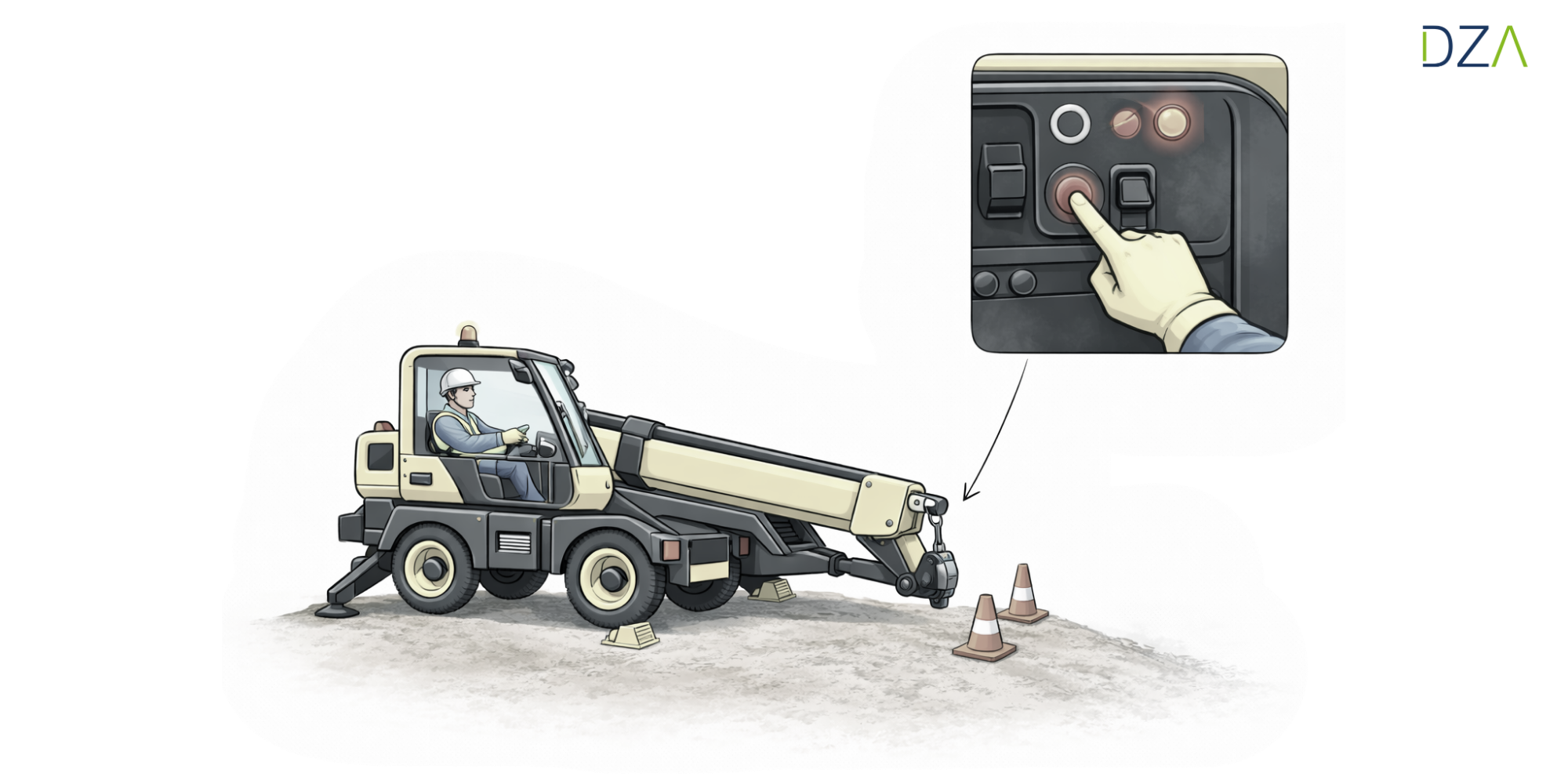 Wenn die Arbeit beendet oder länger unterbrochen wird, muss der Teleskoparm vollständig eingezogen und abgesenktwerden, damit keine Last mehr hängt und das Gerät stabil steht. Anschließend wird die Maschine vollständig ausgeschaltet, um unbeabsichtigte Bewegungen auszuschließen.